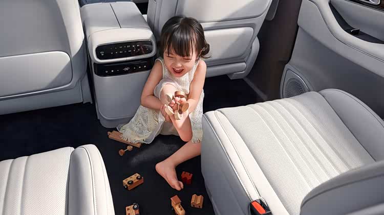来到二排,9.1L智能冷暖冰箱与隐藏式杯托堪称带娃神器。夏日可冰镇果汁、存放辅食,冬季能保温热饮。隐藏式杯托在不使用时完全收纳,避免凸起磕碰到孩子,而高清娱乐屏则能播放动画或学习视频,让长途出行不再枯燥。最值得关注的是三排设计,全尺寸舒适座椅支持150°躺倒,配合0.15㎡的勃朗峰舷窗,即使满载六口人,老人或孩子也能半躺看风景,彻底告别三排委屈座的尴尬。