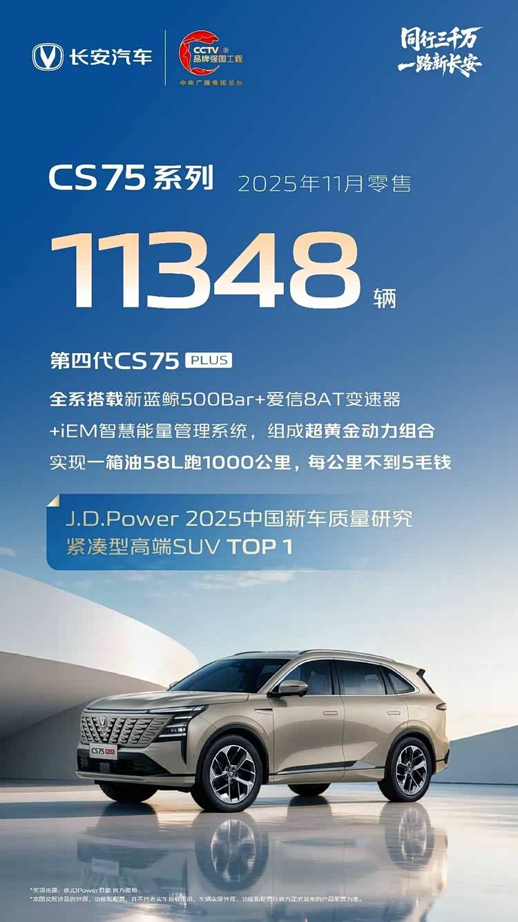 11月,长安CS75系列继续高歌猛进,交出单月销售11348辆的成绩单,是十一年累计超过280万用户的选择,约占集团3000万辆的十分之一!就在今年,长安CS75还获得了“J.D. Power 2025中国新车质量研究(IQS)紧凑型高端SUV第一名”的殊荣,第四代CS75PLUS荣膺“中国汽车质量网 2025中国汽车质量奖”“2025年度智慧高性能SUV”等多项大奖,在细分市场上一骑绝尘。