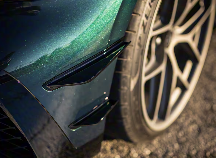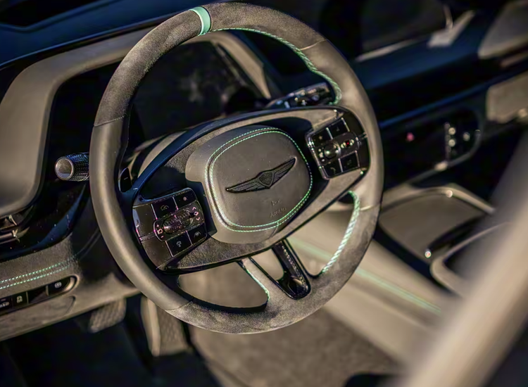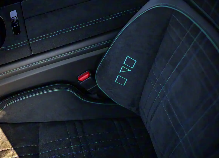 内饰氛围同样专注于性能与豪华的结合,大量使用了翻毛皮材质,并点缀以绿色缝线。方向盘中央设有回正标识,筒形运动座椅与中央扶手等处的设计也强化了包裹感与竞技风格。