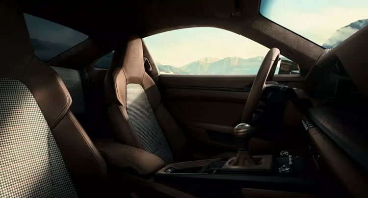 保时捷911 GT3 90 F.A.Porsche限量版内饰采用了复古棕色为主的色调,运用了大面积网格编织软性材质铺陈,座椅采用松露棕皮革与织物混搭材质,坐垫和靠背还加入了千鸟格图案,融合黑、绿、松露棕、奶油及波尔多红多种色彩。还加入了随处可见的90年F.A的浮雕图案,凸显出了整车的独特魅力。中控台配备了保时捷911经典的小尺寸赛车方向盘,操控岛配备了传统的手动圆头换挡杆,它采用了开孔胡桃木材质,还保留了很多实体物理按键。仪表台镶嵌的金色铭牌刻有初代911轮廓剪影、F.A.保时捷的亲笔签名以及限量90台的字样。