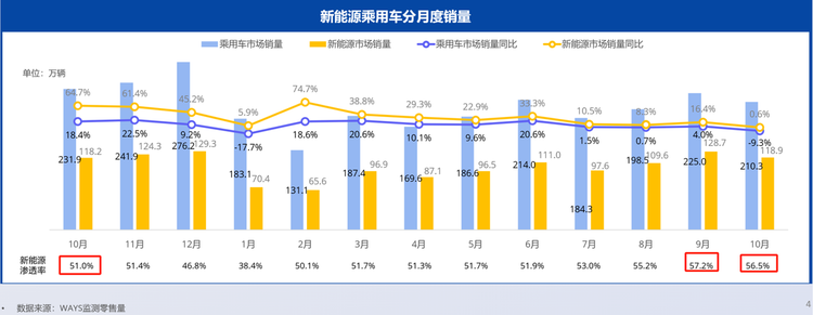 10月份,新能源销量占到乘用车总体销量的56.5%,相比于9月份,减少了0.7%,相比于去年同期,上涨了5.6%。