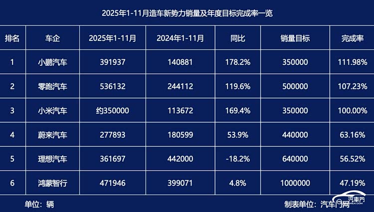 2025年临近尾声,又到了各大车企兑现年度销量目标的时候。其中,新势力们纷纷公布销量,有的新势力车企已经率先交卷,但一部分新势力车企与年度销量目标仍有较大差距。本篇就对新势力今年前11月销量和年度目标完成率进行盘点分析。