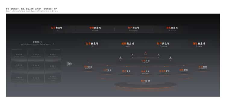 作为行业安全技术的先行者与引领者,吉利在“全域AI”技术体系的赋能下,以“AI为纲 责任为本”,基于原有的“全域安全”技术体系进阶打造“全域安全2.0”技术体系。结合智能时代的安全新需求和新挑战,“全域安全2.0”技术体系秉持“以人为尊”理念,通过技术升级、能力突破与范式创新,将侧重“整车安全”的视角升级为“人-车-路-云-星”的生态视角,旨在贯穿用户出行全场景、覆盖出行全领域、联动出行全生态;并以“生命零伤亡、健康零危害、财产零损失、隐私零泄露”四大安全愿景为指引,逐步构建的一套为消费者提供全面的安全保障技术体系。