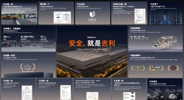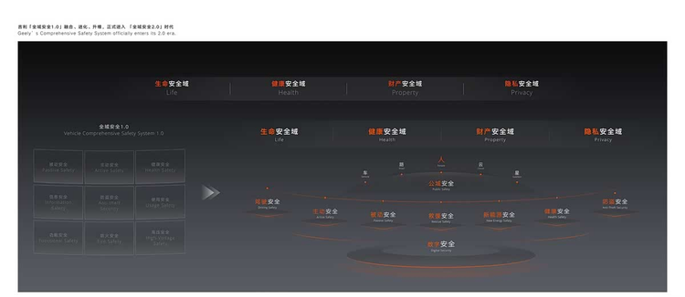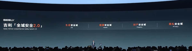 在安全理念上,吉利提出了“全域安全2.0”,涵盖生命安全、健康安全、财产安全和隐私安全四个维度。这一体系将从以往侧重车辆本身的安全性能,逐步转向更多关注驾驶者、乘员及相关道路参与者的综合安全。此外,其还将“汽车安全”的范畴从车内人员与行人延伸至公共安全领域,试图在行业与社会层面构建更广泛的安全支持体系。