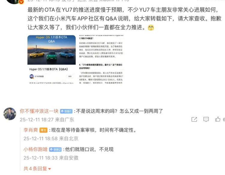 小米汽车副总裁李肖爽回应 YU7 OTA 推送延迟:正在等待备案审核