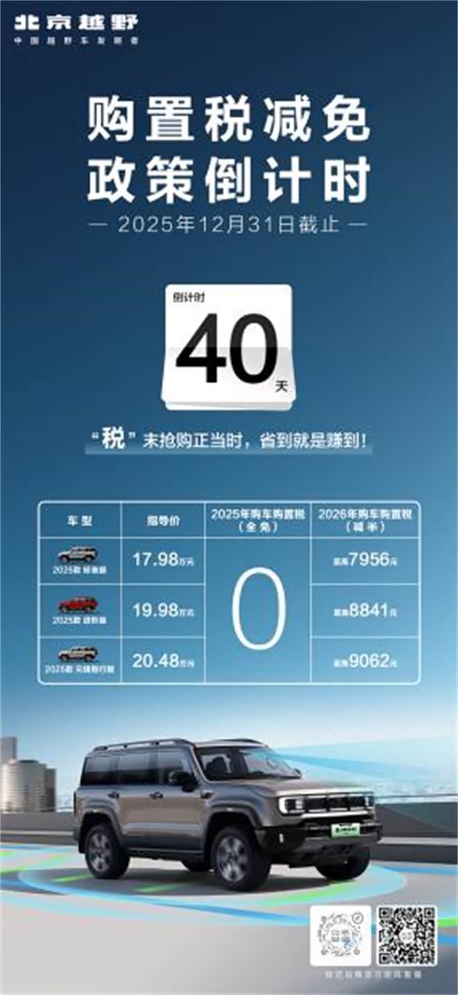 对于消费者来说,当前选购BJ40增程的理由不仅因为其硬核产品实力,还有一重政策原因。根据政策规定,对购置日期在2024年1月1日至2025年12月31日期间的新能源汽车免征车辆购置税。自2026年1月1日起,新能源汽车购置税将调整为减半征收。2025年剩余时间已成为能够享受购置税全面优惠、节省购车成本的最后黄金期。