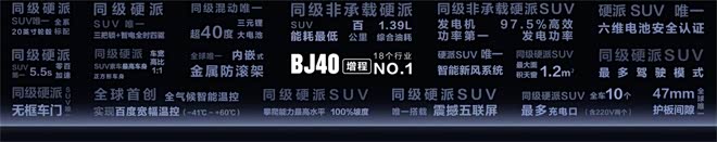 城市通勤,BJ40增程也能做到面面俱到,满油满电情况下可实现1200公里的综合续航;1.33L/100km综合油耗,能耗同级最低;5.5秒零百加速性能,比肩城市轿跑;搭载四轮独立悬架,公路稳定性比肩城市SUV。