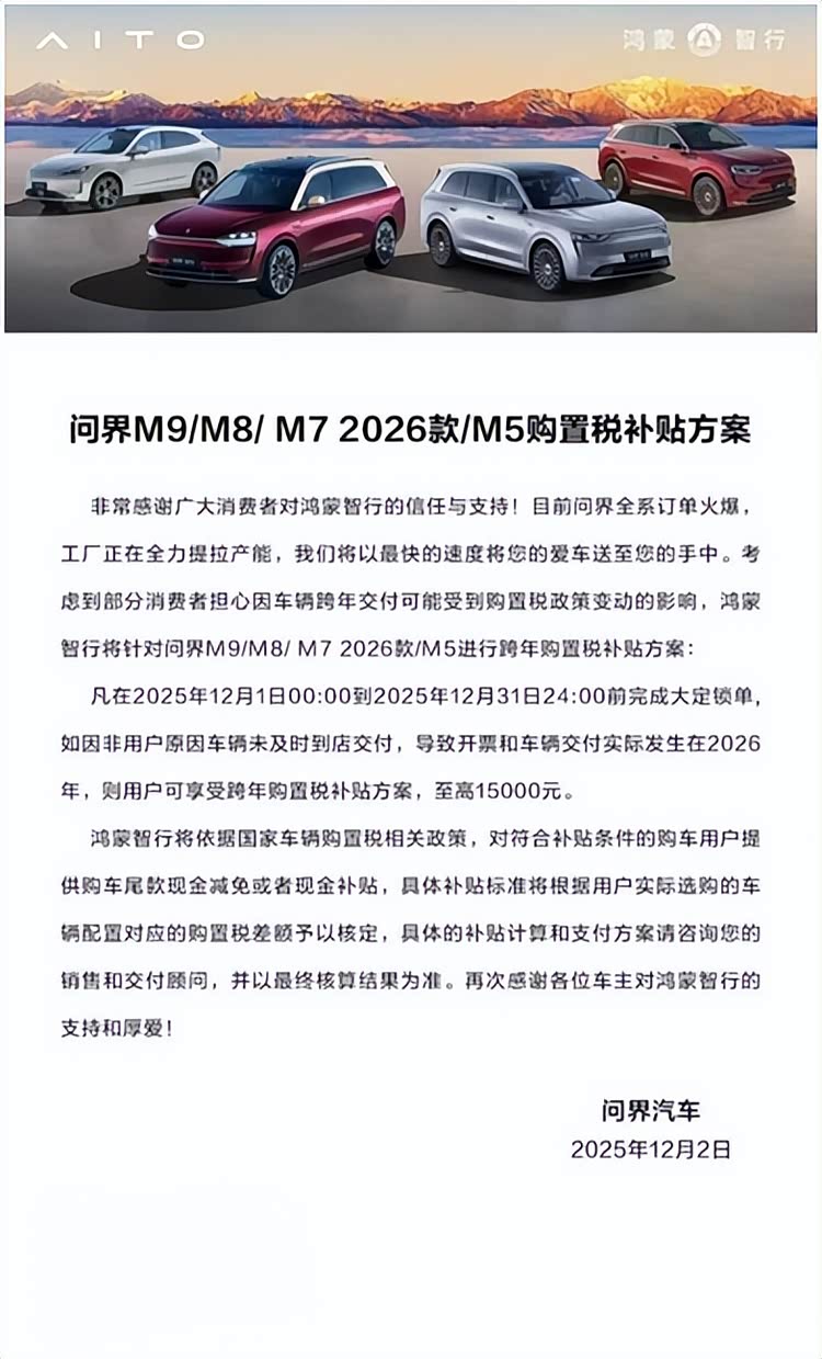 年终购车季,消费者在欣喜于众多选择的同时,也常因跨年交付可能产生的政策风险而举棋不定。针对这一普遍关切,问界汽车于12月初率先行动,推出专项购置税补贴方案,为选择问界M8的用户吃下“定心丸”。根据补贴方案,2025年12月1日00:00至2025年12月31日24:00前完成大定锁单,如因非用户原因车辆未及时到店交付,导致开票和车辆交付实际发生在2026年,则用户可享受至高15000元购置税补贴方案。该补贴将以购车尾款减免或现金补贴形式发放,具体补贴标准将根据用户实际选购的车辆配置对应的购置税差额予以核定,切实保障用户利益,让年末购车决策更加轻松果断。