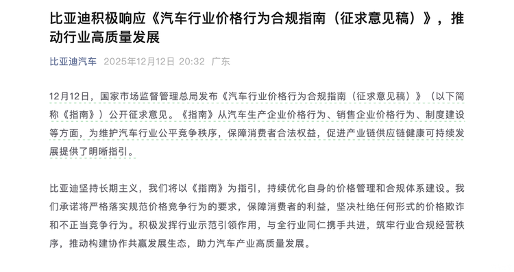 比亚迪的回应体现了企业对合规经营的重视,作为国内汽车行业的重要参与者,比亚迪在电动车等领域有着广泛布局,其价格策略往往受到市场密切关注。公司此次主动表态,不仅是对监管政策的支持,也反映出企业自身在内部管理上的调整方向。实际上,优化价格管理并非一蹴而就,它需要企业从制度设计到执行监督的全流程把控。比亚迪提到将“持续优化”,这暗示了其可能通过培训、审计或技术手段来落实指南要求,确保价格行为在合规轨道上运行。