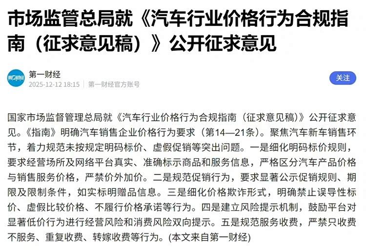 近期,市场监管总局接连出手,围绕汽车行业价格行为和广告乱象发布征求意见稿,释放出要给“内卷式竞争”踩刹车的明确信号。