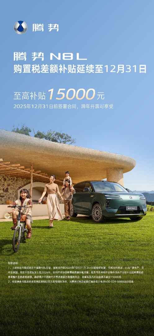 2026年日益临近,为应对新能源汽车购置税从全额免征调整为减半征收的政策变化,即日起,腾势汽车针对腾势N8L车型,正式推出购置税延续补贴政策,为消费者兜底,保证购车成本不会因政策变化而增加。