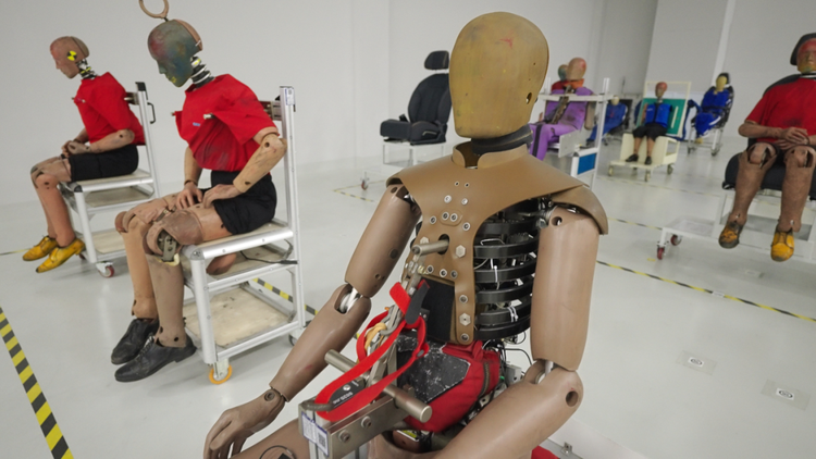 这其中,假人的身上密布着很多传感器,核心作用就是模拟真人在碰撞发生时,身体各部位将会受到的伤害程度。