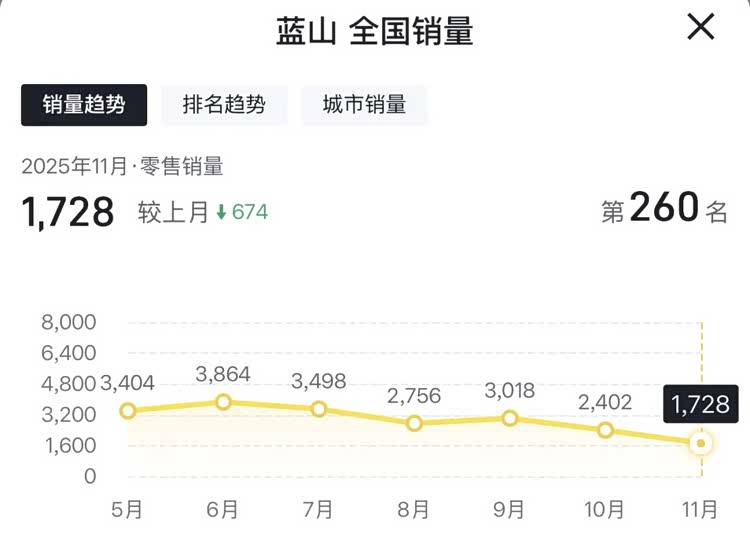 魏牌高山的销量高歌猛进,但是和魏牌高山形成鲜明对比的是魏牌蓝山的销量却在不断地下滑,11月份魏牌蓝山的销量已经下滑到了1700多辆,这算是近几个月的销量新低了,按理说魏牌蓝山的销量不应该呈现这样的局面,毕竟产品力还是有的,当初上市的时候也是被魏建军带的爆火!