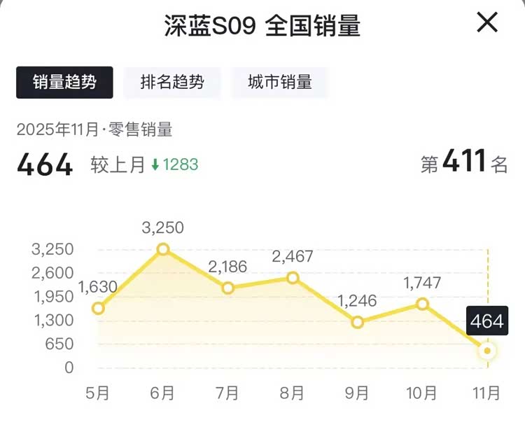 奇瑞风云 T11预售期间表现亮眼,预售 18 天大订锁单量达 28732 辆,上市 24 小时大定订单更是突破 3.8 万辆,但现在首月交付仅有4499辆,那么到底是产能不足呢?还是被交付不及时呢?更或是销量不行呢?我们也期待12月份奇瑞风云 T11的市场表现。第四名,深蓝 S09(售价23.99万元-30.99万元)11 月销量:464 辆,跌至三位数的惨淡成绩,标志着这款高端战略车型已陷入 “销量与口碑双崩盘”。自 6 月首月销量 3000 + 后,其销量逐月下滑,10 月降至千辆级,11 月再遭重创。