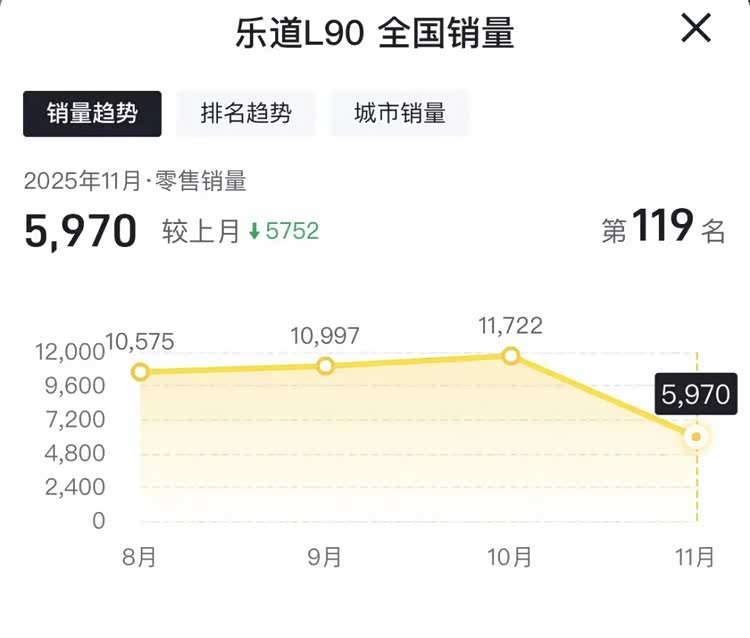 其成功核心源于三重优势:一是定价精准,18.38 万元起售价格直击家庭用户预算痛点,在 20 万级六座 SUV 市场形成性价比碾压。二是品牌赋能,吉利银河品牌 11 月整体销量同比增长 76%,强大的体系力为 M9 提供了渠道与口碑支撑。三是技术契合需求,作为增程式混动车型,其产品路线贴合当前 45% 市场份额的混动主流阵营,完美平衡续航与油耗焦虑。第二名,乐道 L90(售价26.58万元-30.68万元)11 月销量为 5970 辆,相比 10 月的 11722 辆大幅下滑 5752 辆,环比跌幅达 49.07%,上市三个月后首次跌破万辆大关。不过从品牌交付数据来看,乐道品牌 11 月共交付新车 11794 台,乐道 L90 上市 4 个月累计交付量仍有 39319 台。