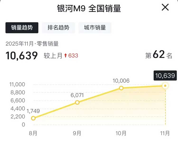 第一名,银河 M9(售价18.38万元-24.88万元)11月销量:10639 辆,上市不足 3 个月累计销量突破 2.8 万辆,延续了 9 月上市以来的 “爆款体质”—— 首个完整销售月即破万,11 月再攀高峰,成为 C 级混动 SUV 市场的绝对黑马。