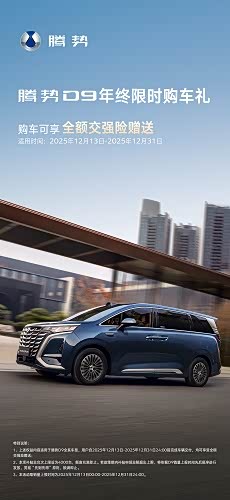 从打破合资垄断,到成为全球首个达成30万辆交付的新能源MPV,腾势D9所取得的每一项成绩,都源自用户的真实选择与长期信赖。此次面向购车用户全额赠送交强险的年终政策,不仅是一项购车权益,更是腾势汽车对用户价值的持续回应。年终购车政策已全面开启,腾势D9正等待更多用户与冠军同行,向美好生活腾势而上!