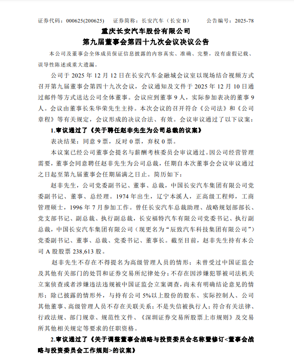 12月12日消息,长安汽车在重庆总部召开第九届董事会第四十九次会议,审议通过聘任赵非为公司总裁等多项议案,任期至本届董事会届满。根据公告,赵非目前持有公司A股23.86万股,相关任命即刻生效。