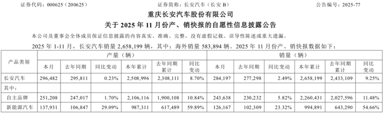 前三季度长安汽车累计销量为206.61万辆,同比增长8.46%。其中自主品牌累计销量为175.04万辆,同比增长10.47%;新能源汽车销量为72.42万辆,同比增长59.72%。海外市场方面,长安汽车前三季度累计销量为46.53万辆。