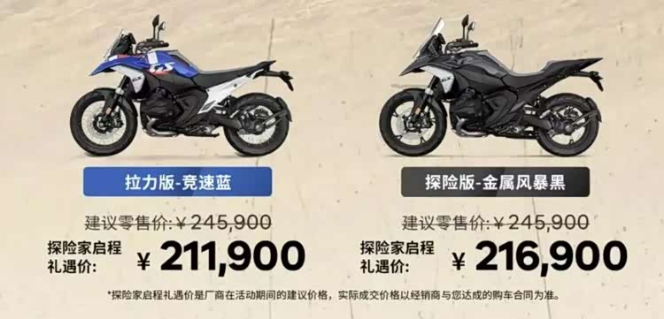 据悉,宝马R1300 GS拉力版的价格从245900元降到211900元,降幅达3.4万元;R1300 GS探险版的价格从245900元降至216900元,降幅达2.9万元(应该都是2024款)。除了降价,购车还赠送原厂边箱、骑行靴、机油保养套餐、宝马小熊等。R1300 GS系列搭载双缸水冷“拳击手”发动机,排量1300cc,最大功率107kW,最大扭矩149N·m,采用轴传动,油箱容量19L,座高800mm,配备自适应电子悬挂、前后ABS、TCS、胎压监测、定速巡航等配置。
