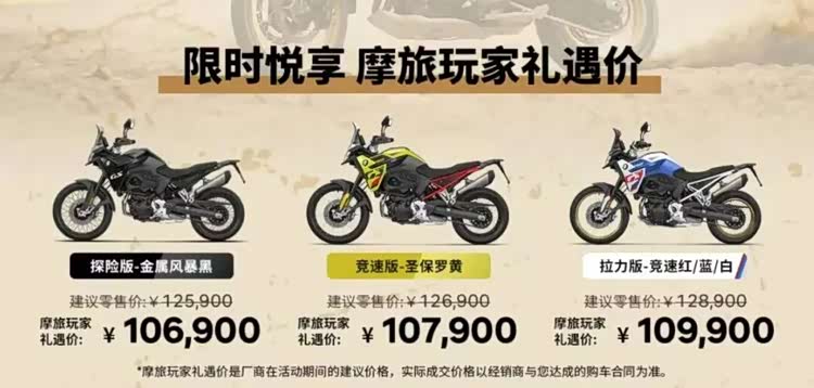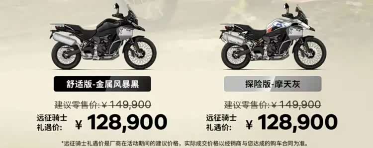 F900 GS系列全线均降价1.9万元,探险版价格从125900元降至106900元,竞速版价格从126900元降至107900元,拉力版价格从128900元降至109900元。F900 GS ADV全线均降价2.1万元,舒适版和探险版的价格均从149900元降至128900元。F900 GS和F900 GS ADV为同平台车型,采用直列双缸发动机,精确排量895cc,最大功率66kW。最大扭矩93N·m,最高车速200km/h,采用链条传动,油箱容量14.5L,座高835mm,标配前后ABS、TCS、雨天/公路模式。