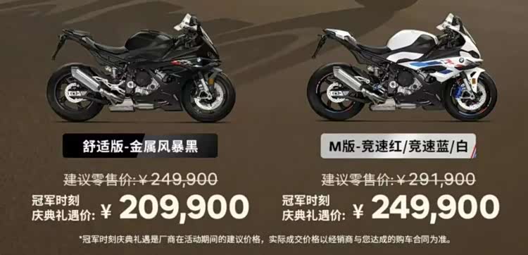 宝马公升级跑车S1000RR舒适版的价格从249900元降至209900元,降幅达到4万元;S1000RR M版的价格从291900元降至249900元,降幅高达4.2万元。此外,购车还赠送原厂骑行夹克和宝马小熊。S1000RR搭载直列四缸水冷+ 油冷发动机,实际排量1001cc,最大功率154kW,最大扭矩113N·m,采用链条传动,主油箱容积16.4L,座高824mm,配备铝制后摇臂,标配电子悬挂、双向快排、弯道ABS、TCS等配置。