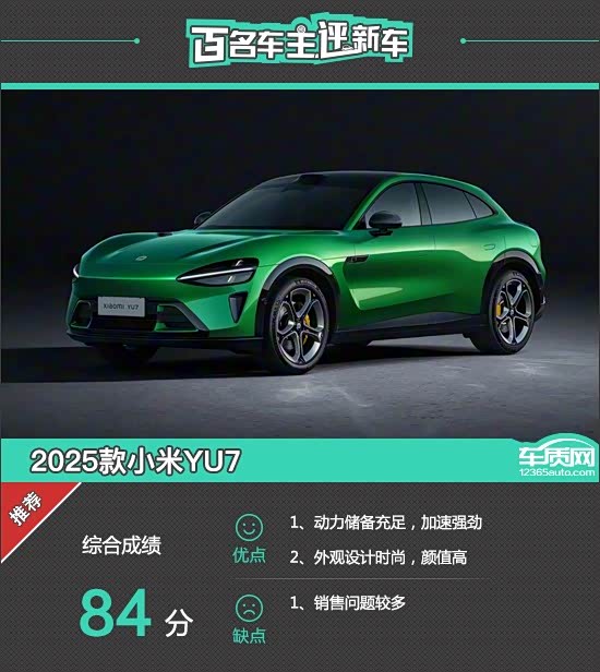 在收集到的103份有效问卷中,根据车主对2025款小米YU7在车型基本面、驾乘感受、使用成本以及质量可靠性、售前/售后服务方面给出的真实评价,在此次调查中2025款小米YU7的综合得分为84分,达到了车质网的推荐标准。