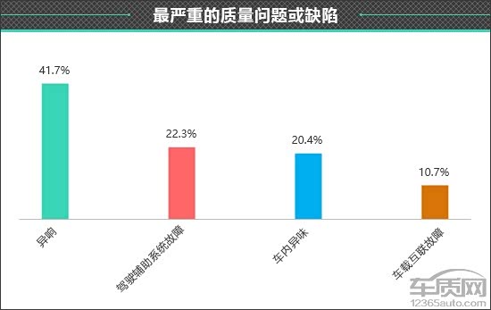 在对车主的进一步调查中我们发现,车身附件及电器出现非人为故障的占比相对较高,这也体现在“这款车最严重的质量问题或缺陷”调查结果中。经调查发现,车主在“异响”方面的问题抱怨最多,占比为41.7%。