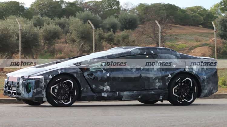 车身侧面来看,新车的车身比例和传统超跑有明显不同,前挡风玻璃和前舱盖几乎是一条直线,对于风阻会比较友好,而且A柱部分侧窗的尺寸非常大,这会让驾驶员的侧向视野非常开阔;前翼子板位置可能会有导流槽,侧裙部分还会有空气动力学套件,轮毂采用了多幅式双色造型,搭配有大尺寸刹车盘,轮胎则是倍耐力P Zero系列。