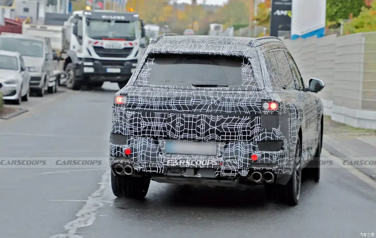 侧面保留经典门窗线条,大尺寸轮圈依旧是硬派标配,同时首次引入隐藏式门把手,兼顾科技感与低风阻。目前谍照中尾灯仍为临时伪装,但据推测可能采用类似iX3的全新家族式尾灯样式;双边共两出排气布局则彰显燃油版身份,运动感拉满。