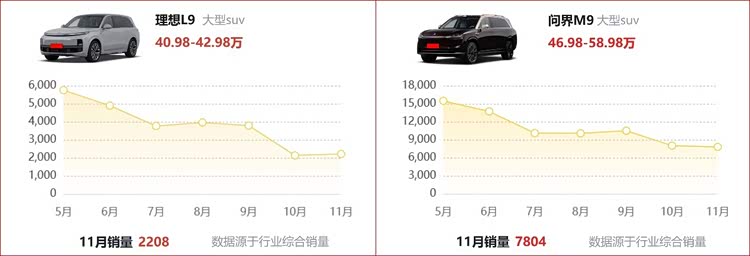 不知道您有没有发现,国内车市不少“当时现象级的9系车型”,或随着自家推出低端产品之后,或受市场竞争、消费者喜好转变和审美疲劳影响,销量正呈逐渐下滑趋势,比如 理想L9(参数|询价),比如问界M9,我们先来看看这两款车型近半年左右的销量曲线。