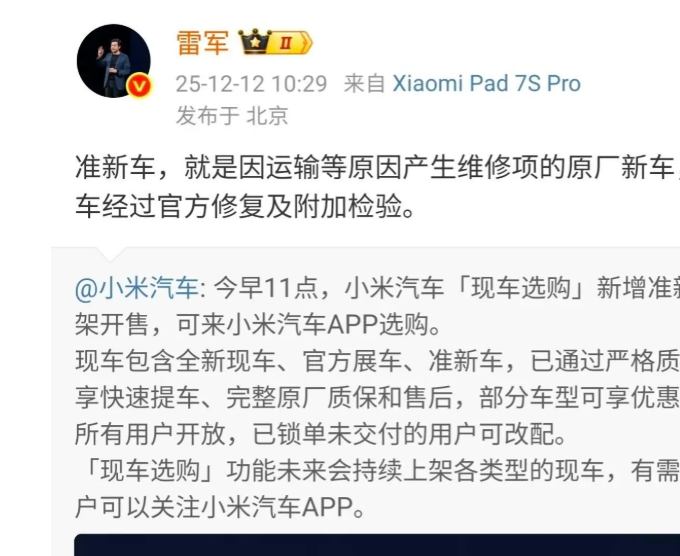 对于“准新车”的定义,小米官方称这是曾因运输等原因产生维修项的原厂新车,并已完成官方修复及售前附加检验。小米创办人、董事长兼 CEO 雷军在个人评论区回复称:“准新车不是我们发明的,我们只是沿用了同行的名字”。