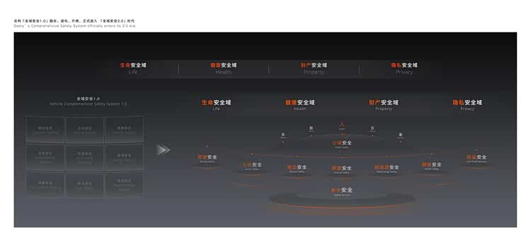 作为行业安全技术的先行者与引领者,吉利在“全域AI”技术体系的赋能下,以“AI为纲责任为本”,基于原有的“全域安全”技术体系进阶打造“全域安全2.0”技术体系。结合智能时代的安全新需求和新挑战,“全域安全2.0”技术体系秉持“以人为尊”理念,通过技术升级、能力突破与范式创新,将侧重“整车安全”的视角升级为“人-车-路-云-星”的生态视角,旨在贯穿用户出行全场景、覆盖出行全领域、联动出行全生态;并以“生命零伤亡、健康零危害、财产零损失、隐私零泄露”四大安全愿景为指引,逐步构建的一套为消费者提供全面的安全保障技术体系。
