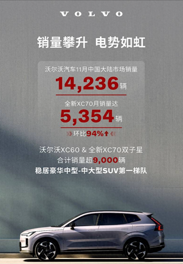 如果说2025年豪华车市场谁比较受欢迎,喵哥觉得沃尔沃全新XC70可以有一个席位,这款9月26日才正式上市的车型,10月还在积累口碑,11月销量就达到5354辆,环比增长94%,上市第二个完整月就成为了沃尔沃品牌销冠,截至11月底累计销量已达到9211辆,距离月销万辆的成绩不远了。