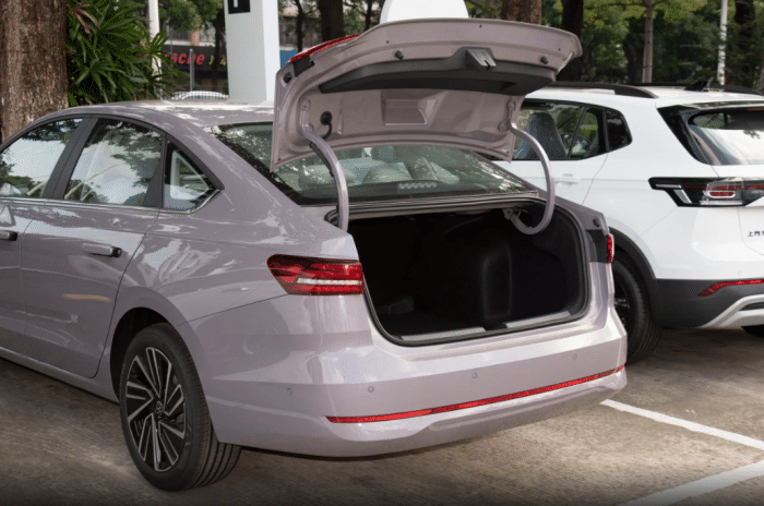 再看车侧,流线型的低风阻车顶从车头滑到车尾,一点不拖沓,风一吹过去都能少点阻力,跑高速的时候油耗也能更省心。车身侧面还藏着三条好看又实用的线条让车身看着不单薄,特扎实。不管是停在小区楼下,还是开在路上,这侧面线条都特显优雅,带家人出门看着就舒服。车尾更有看头!全系标配的展翼式LED贯穿尾灯,一踩刹车整条都亮,晚上老远就能看见,辨识度拉满,跟后车保持安全距离也更有保障。再加上导流式的隐藏排气,把排气管藏得严严实实,车尾看着干干净净、整整齐齐,一点不杂乱,反而透着股运动范儿,家用车也能有这种动感,太对胃口了!