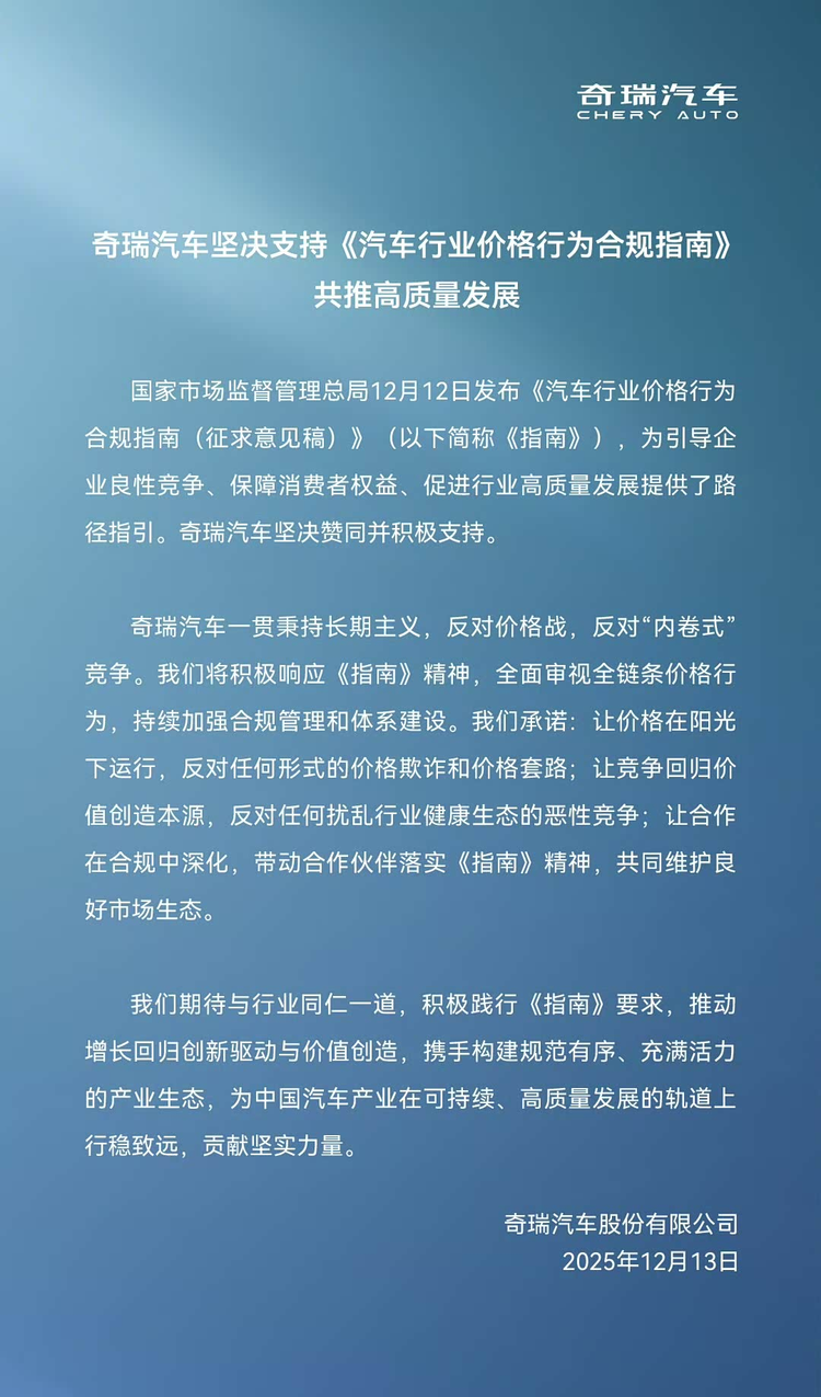奇瑞汽车明确反对价格战和“内卷式”竞争,公司指出,将全面审视全链条价格行为,加强合规管理和体系建设。奇瑞承诺让价格在阳光下运行,反对价格欺诈和套路;同时推动竞争回归价值创造本源,反对扰乱行业生态的恶性竞争。此外,奇瑞还表示会带动合作伙伴共同落实指南要求,维护良好市场生态。这种观点突出了企业对于行业整体健康的关注。