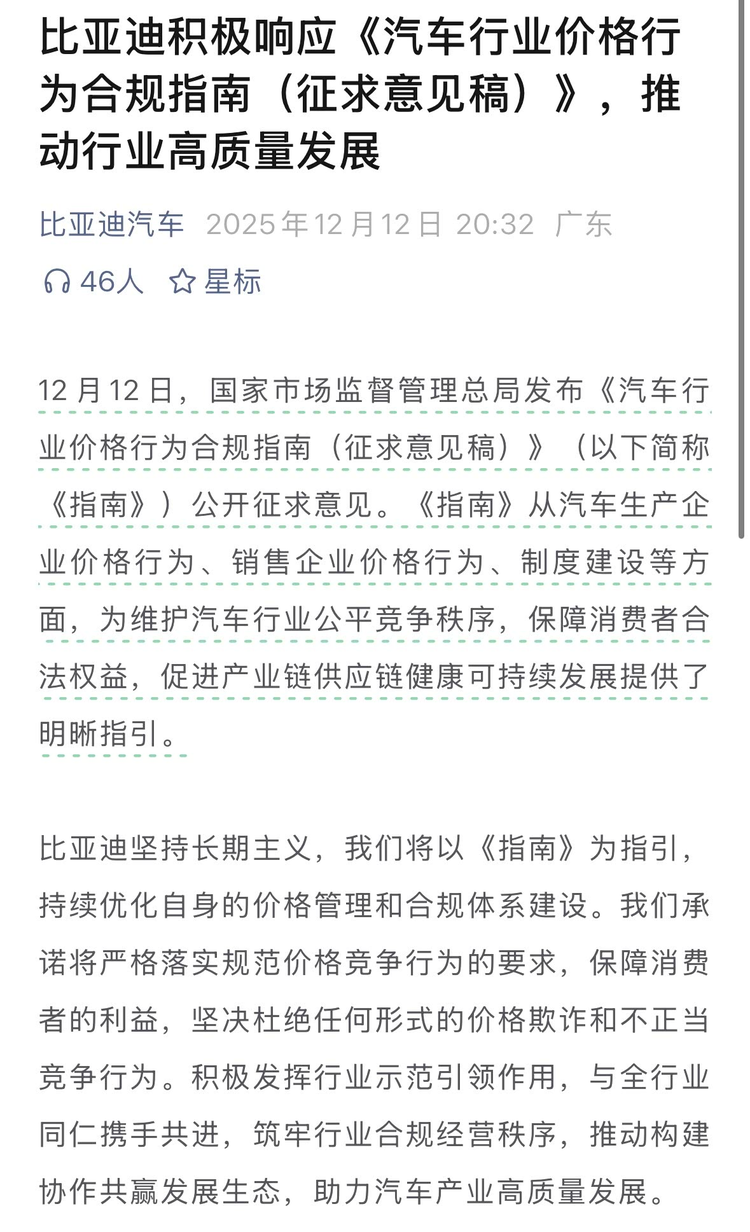 比亚迪在回应中称,会持续优化价格管理和合规体系建设,严格规范价格竞争行为。公司表示,保障消费者利益是首要任务,因此将杜绝任何形式的价格欺诈与不正当竞争。比亚迪作为行业中的重要参与者,其表态有助于带动整体氛围向合规方向转变。