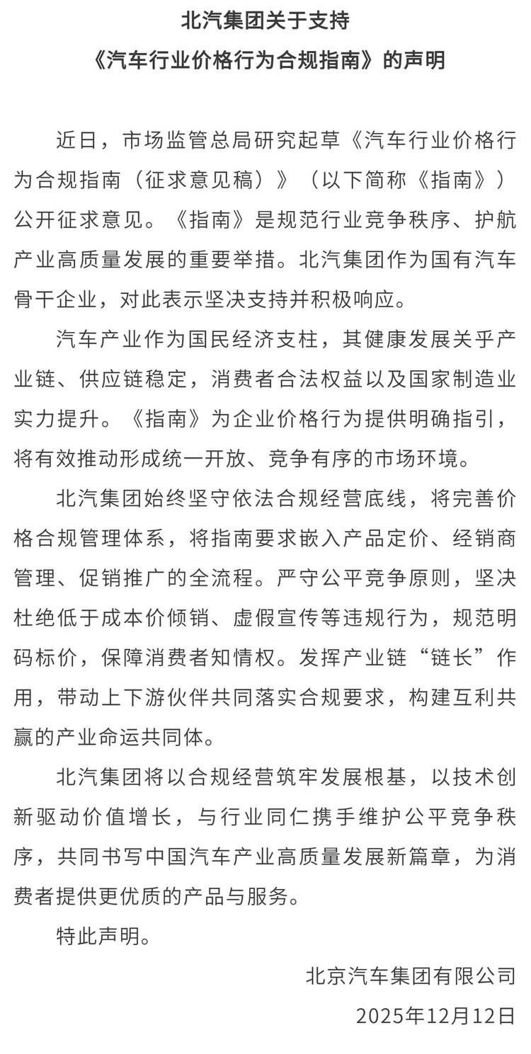 北汽集团在回应中强调,将坚守依法合规经营底线,完善价格合规管理体系。公司计划将指南要求嵌入产品定价、经销商管理、促销推广的全流程,严守公平竞争原则。北汽表示,会坚决杜绝低于成本价倾销、虚假宣传等违规行为,规范明码标价,保障消费者知情权。同时,作为产业链“链长”,北汽希望带动上下游伙伴落实合规要求,构建互利共赢的产业命运共同体。这种表述展现了大型企业在产业链中的责任担当。