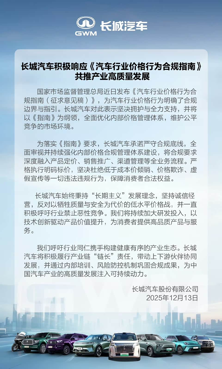 长城汽车承诺严守合规底线,全面强化内部价格合规管理体系建设,公司表示,会将合规要求深度融入产品定价、销售推广、渠道管理等全业务流程,严格执行明码标价。长城强调,坚决杜绝低于成本价倾销、价格欺诈、虚假宣传等违法违规行为,以保障消费者合法权益。此外,公司坚持诚信经营,反对以牺牲质量与安全为代价的低水平价格战,并呼吁行业禁止恶性竞争。这种立场反映了企业对于产品质量和行业秩序的重视。