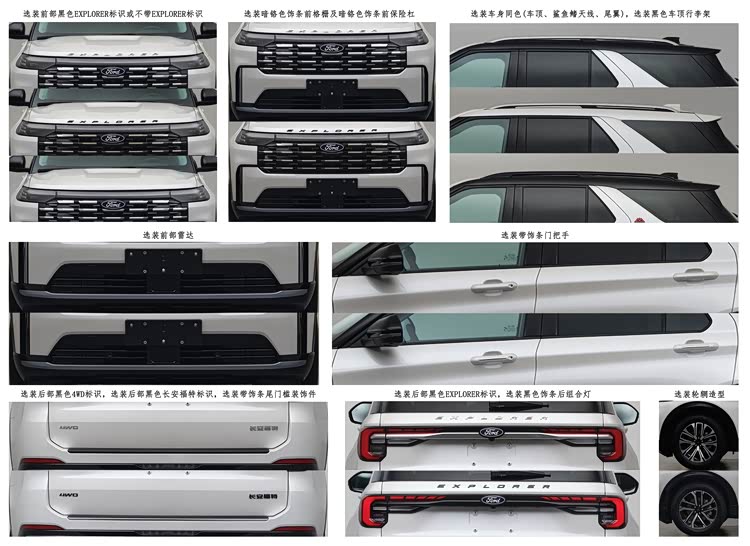 外观设计上,新车的调整主要集中在头部,隔栅样式进行了调整,现款有蜂窝孔洞状的,且稍早的2024款也有贯穿横条银色镀铬结合短条镀铬的。但新款统计样式为等宽横条镀铬,上下共四层,并给出了两处选装,一处是在机盖下沿,有无EXPLORER字标、银色EXPLORER字标和黑色EXPLORER字标三种;另一处是位于隔栅和前保险杠饰条,分亮银色和暗铬色。