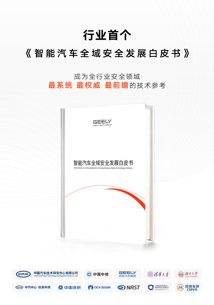 基于全球智能化浪潮推动汽车体验升级与安全技术全面拓展的趋势,吉利联合中汽中心、中国检验认证集团、清华大学等11家产学研机构共同发布了《智能汽车全域安全发展白皮书》,立足产业发展全局,明确以“人”为核心的全域安全目标,为行业安全发展提供了兼具战略性与实操性的行动纲领。