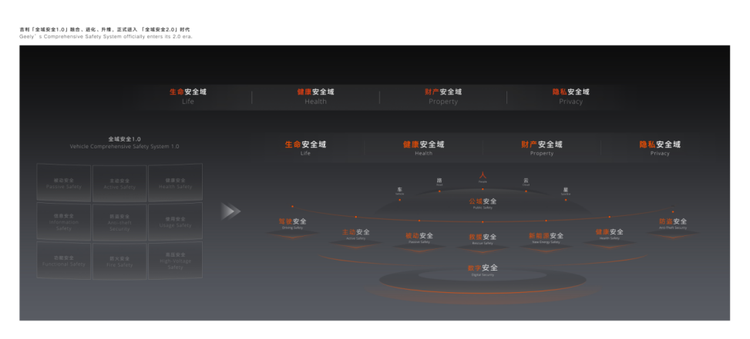 作为行业安全技术的先行者与引领者,吉利在“全域AI”技术体系的赋能下,以“AI为纲 责任为本”,基于原有的“全域安全”技术体系进阶打造“全域安全2.0”技术体系。结合智能时代的安全新需求和新挑战,“全域安全2.0”技术体系秉持“以人为尊”理念,通过技术升级、能力突破与范式创新,将侧重“整车安全”的视角升级为“人-车-路-云-星”的生态视角,旨在贯穿用户出行全场景、覆盖出行全领域、联动出行全生态;并以“生命零伤亡、健康零危害、财产零损失、隐私零泄露”四大安全愿景为指引,逐步构建的一套为消费者提供全面的安全保障技术体系。