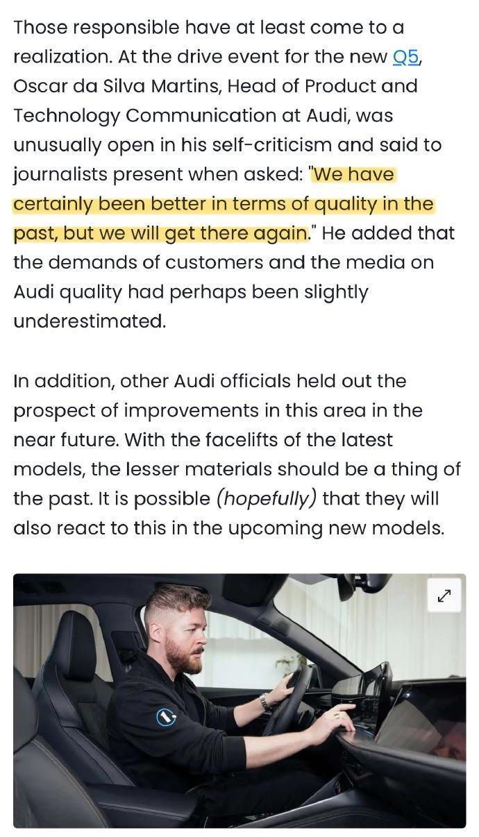 好在奥迪产品技术传播总监Oscar da Silva Martins在新Q5试驾活动的沟通会上表示,公司已察觉问题并将在改款中解决。