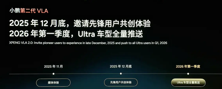 按照之前的信息,在今年11月,何小鹏在小鹏科技日上,官宣了第二代VLA大模型,将会在2026年第一季度全量推送到Ultra车型,第二代VLA支持小路NGP丝滑贯通高速—城区—小路/园区等主要场景,可以让复杂小路平均接管里程提升13倍,并智能涌现全新能力(如识别交警手势、识别红绿灯逻辑提前应对)等。