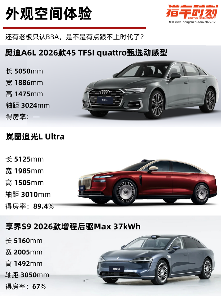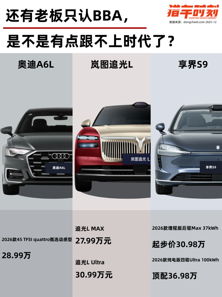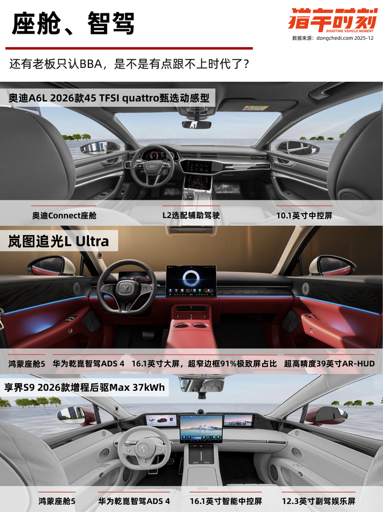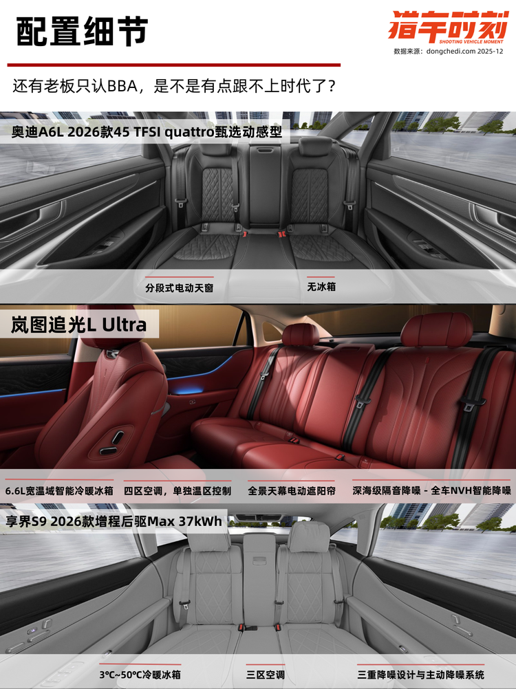 综合来看,岚图追光L把行政级豪华做得均衡且极致;奥迪A6L适合燃油车忠粉,而享界S9则是直接属于鸿蒙智行旗下。