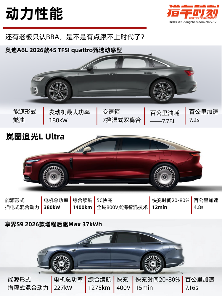 相比之下,享界S9增程版的零百加速在7秒级,奥迪A6L 45 quattro零百加速要7.2秒,其他款甚至要9秒,