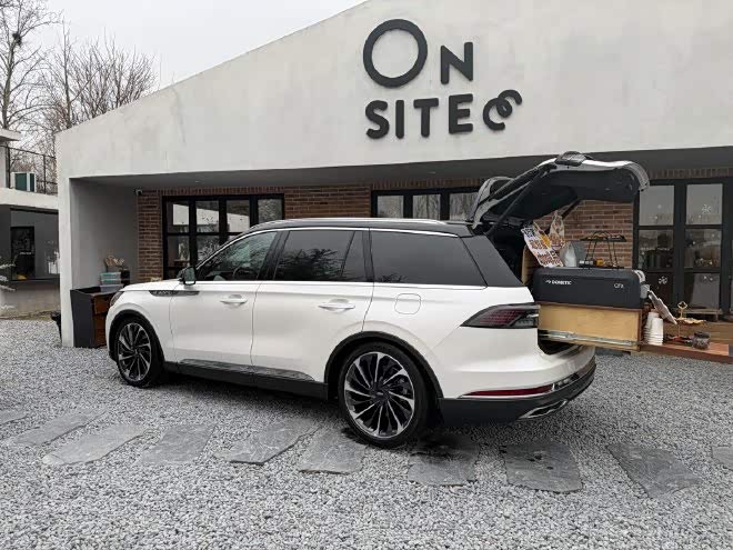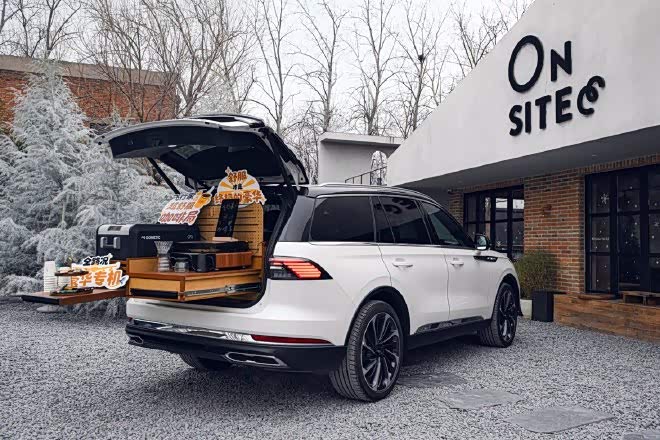 林肯飞行家定位中大型豪华SUV,车身长度超过5米,基于纵置后驱平台打造。Quiet Flight 2.0设计语言让车身比例舒展,为车内空间提供了充足基础。三排座椅放倒后,后备厢容积可扩展至1080升,足以容纳一整套便携咖啡设备,也让“移动咖啡车”的设想变得切实可行。