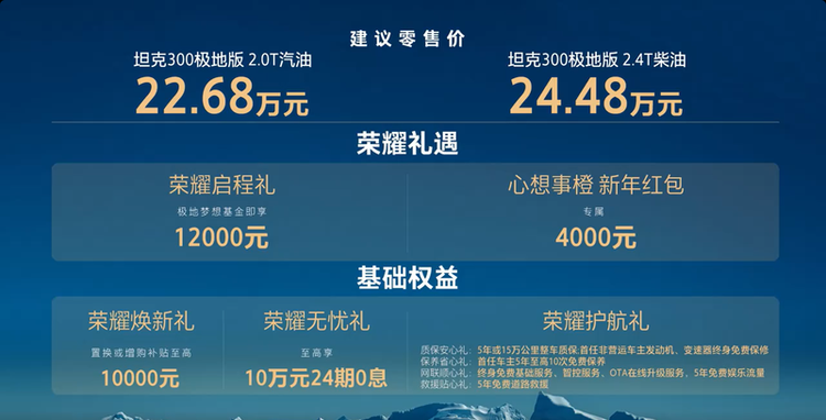 动力方面,坦克300极地版提供2.0T汽油版和2.4T柴油版供选择,匹配国内首款自研纵置9AT变速箱,配备电控分时四驱系统,带中央差速器锁止功能。2.4T柴油版最大功率为137kW,最大扭矩为490N·m。2.0T汽油版最大功率为167kW,最大扭矩为387N·m。