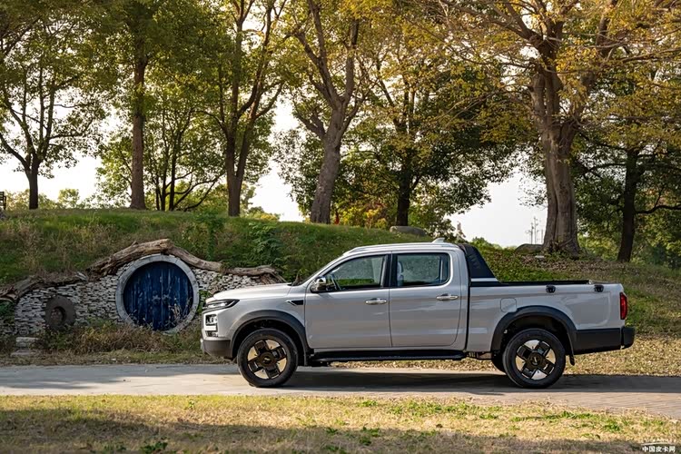 车身侧面线条简洁有力,试驾车型为长轴长箱版本,车身长宽高分别为5620×1965×1920mm,轴距3400mm,使其在视觉上显得十分魁梧。新车配备了金属侧踏板和实用性强的行李架,不仅提升了整车的越野气息,也增强了实用性。