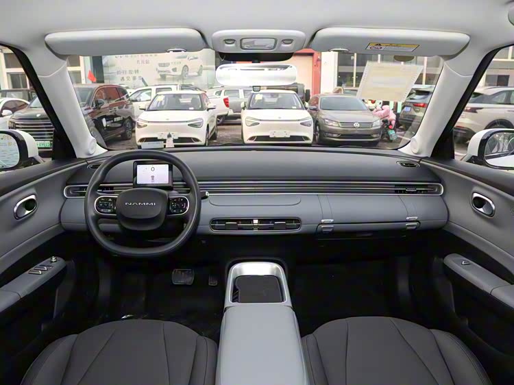内饰部分,纳米01的内饰采用的是T字形的岛台式设计布局,运用了新能源车型极简的风格,中控台上几乎是没有任何实体按键,显得十分简约干净,两幅式的多功能方向盘造型时尚美观,采用的是塑料的材质,仅支持上下调节功能,换挡形式为电子式怀挡,将中间扶手处的空间利用率最大化,下方形成镂空区域,可用来放置女士手提包等物品,并且这种岛台式设计有一个好处在于,如果停好车之后,驾驶员这边车门不方便打开时,可以很方便去到副驾驶位下车,5英寸的全液晶仪表盘尺寸虽然有些小,但是可查看行车信息还算丰富,虽然这台车并未配备中控屏,但是支持手机APP远程控制,可通过手机实现部分车辆功能的操作和信息查看。